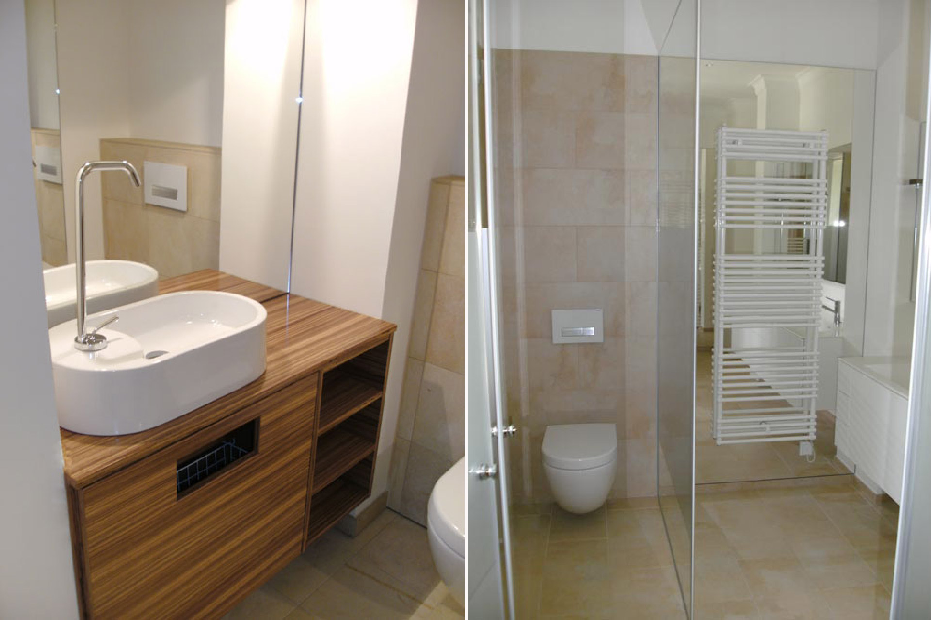 mehrere Bäder in verschiedensten Optiken, Holz, Marmor … Naturmaterialien sind bevorzugt.